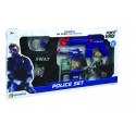 Set per il travestimento da poliziotto, completo di giubbotto, distintivo, radio, orologio, fischietto, manette, pugnale, mitraglietta, pistola e fodero. Con luci e suoni.