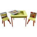 Set arredo cameretta composto da tavolino double face con lavagna incorporata e due sedie abbinate. Il set è fatto in legno di alta qualità decorato a tema giungla.